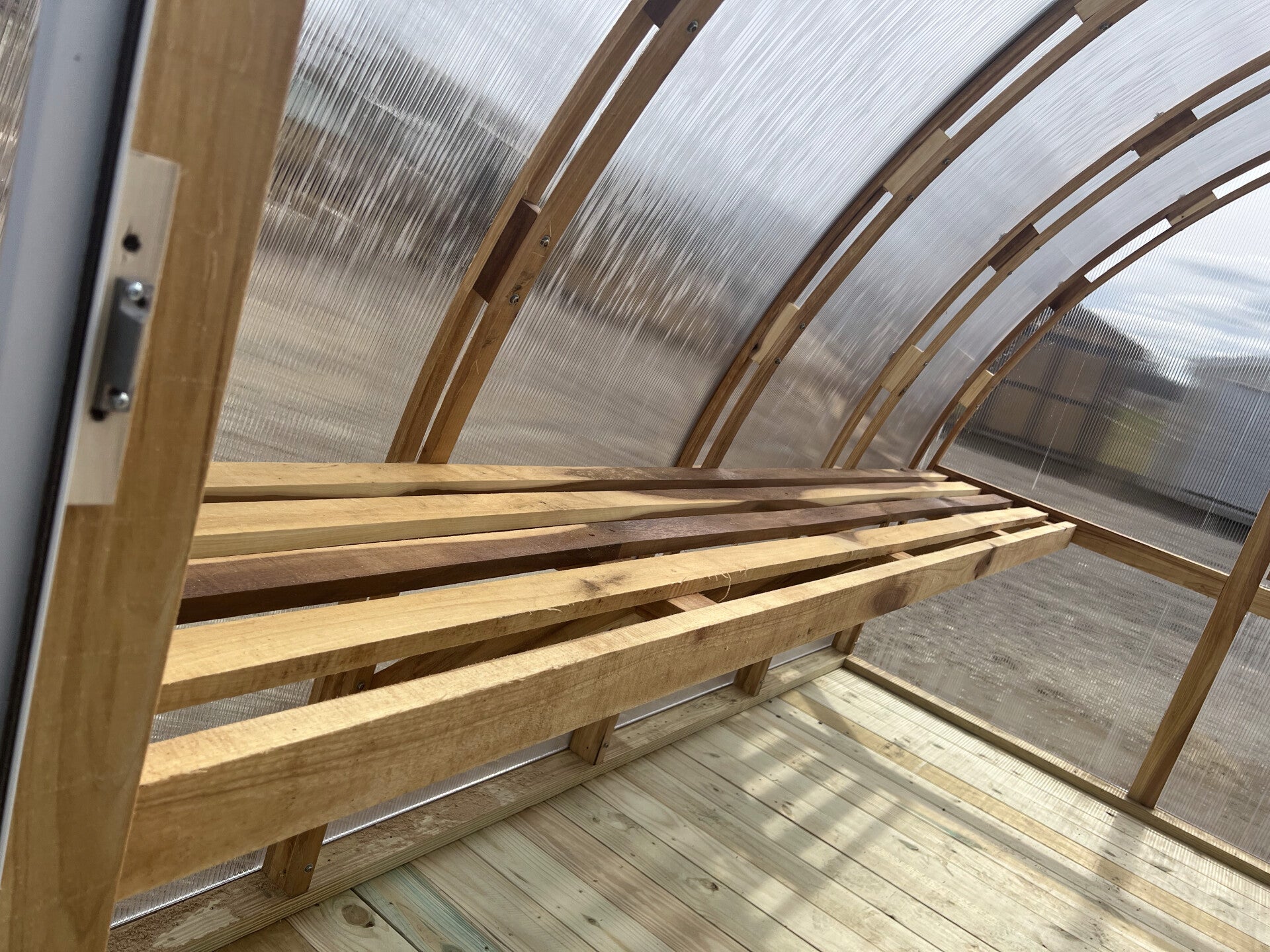 Our Gothic style greenhouse is becoming popular due to its Gothic arch rafter design.This design is much stronger than the average wood framed greenhouse and allows for more sunlight to enter. With their double wall polycarbonate, they are more air tight and easier to heat. They are built on treated 4×4 runners and are designed to sit directly on even ground or on your specifically prepared pad. We build both our free standing sizes and custom on-site builds.